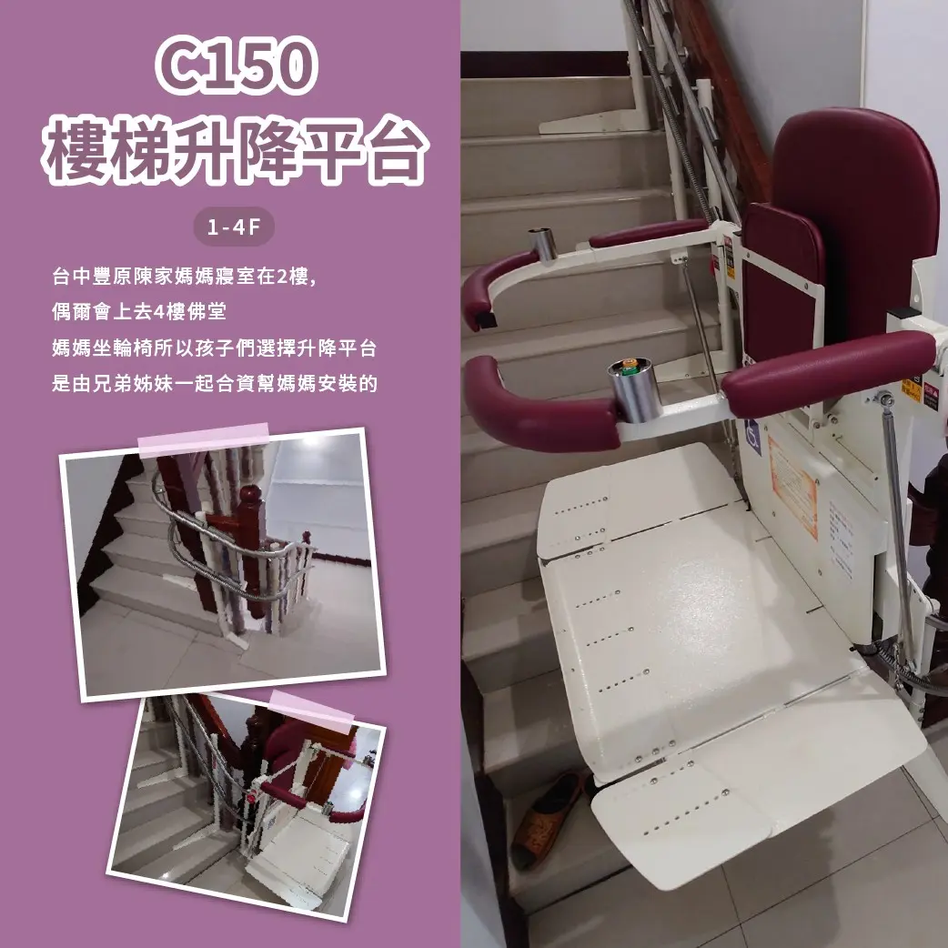 在台中豐原的陳家,兄弟姊妹合資為媽媽安裝了一台 C150樓梯升降平台,