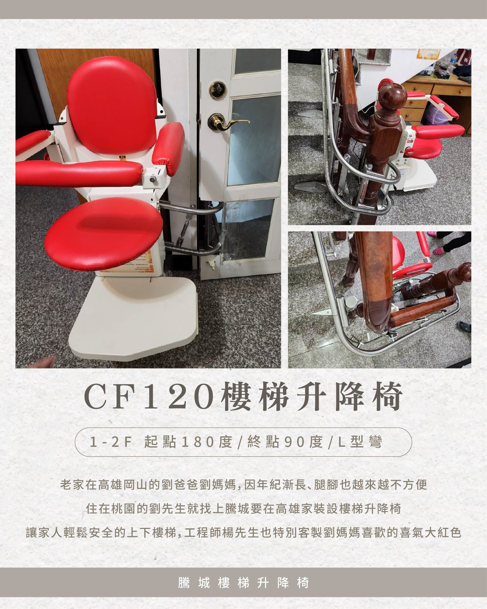 住在桃園的劉先生,看在眼裡、記在心裡於是他找到我們,希望為父母在老家安裝CF120樓梯升降椅從1樓到2樓,起點180度轉彎、終點90度L型收尾每一段設計,只為讓爸媽上下樓時,少一點力氣、多一點安心
