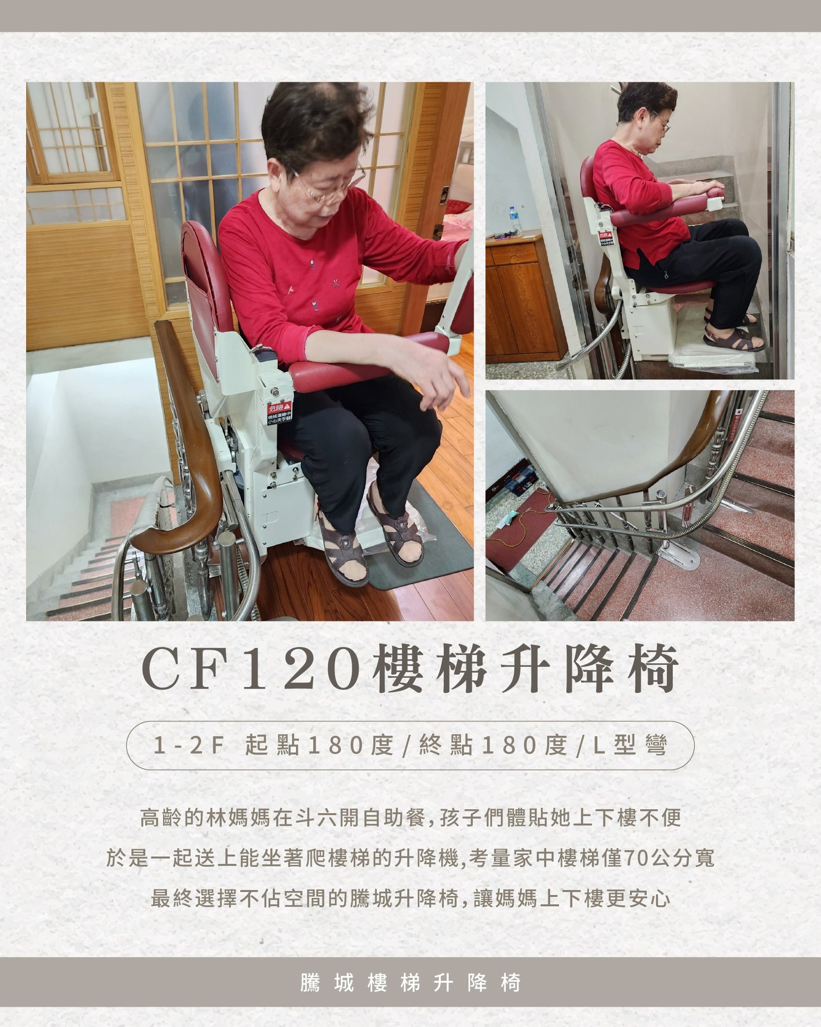 只要輕鬆坐上去,就能穩穩上下樓,讓林媽媽的生活多了一份安心與自在。