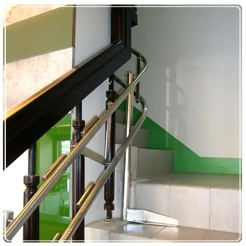 - 起點90度轉彎 設置在櫃台前 供爬樓梯有困難的民眾方便使用 雙軌軌道較細且秀氣 因為獨家製造的實心不鏽鋼軌道 不僅使用時安全無顧慮 也讓軌道與扶手更貼近!