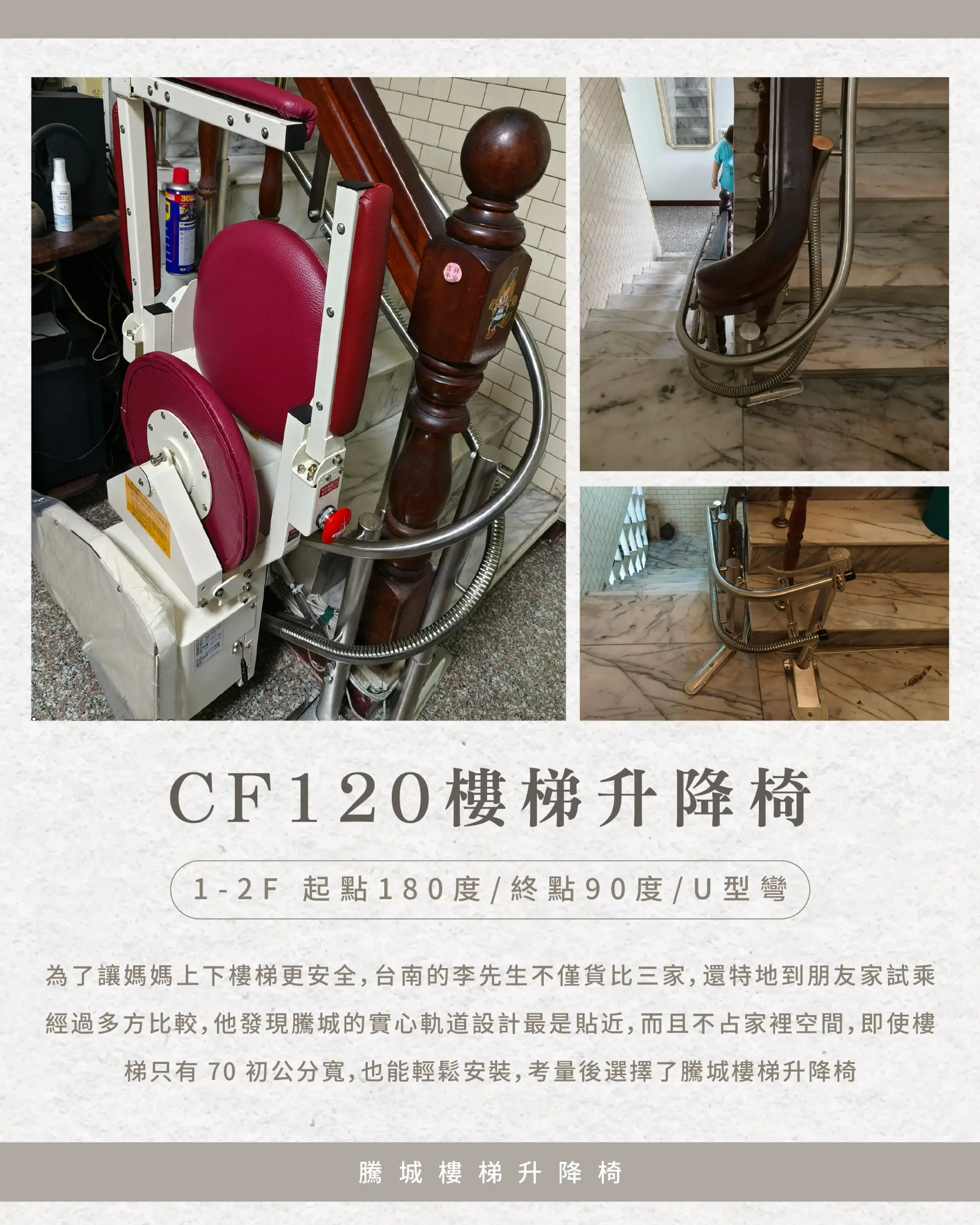 Mr. Lee from Tainan wanted to make it safer for his mother to go up and down the stairs, so he personally visited multiple companies, and even asked friends to test‑ride different models for comparison. In the end, he chose the Teng Cheng CF120 Stairlift.
