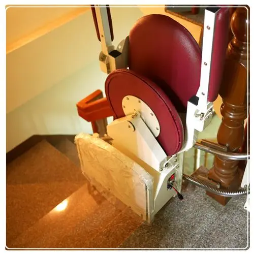 Even with multiple turns and corners, Teng Cheng ensures every stair lift is efficiently designed through solid-rail construction and precise engineering — minimizing installation space without compromising performance.Of course, the sturdy base columns are another vital detail that guarantees overall safety and stability.The elegant red seat, paired with a solid stainless-steel rail and baked-enamel support posts, embodies true Taiwanese craftsmanship — durable, beautiful, and easy to maintain.And when time takes its toll, the sofa-style seat cover can be easily removed and replaced, keeping your stair lift fresh and comfortable for years to come.