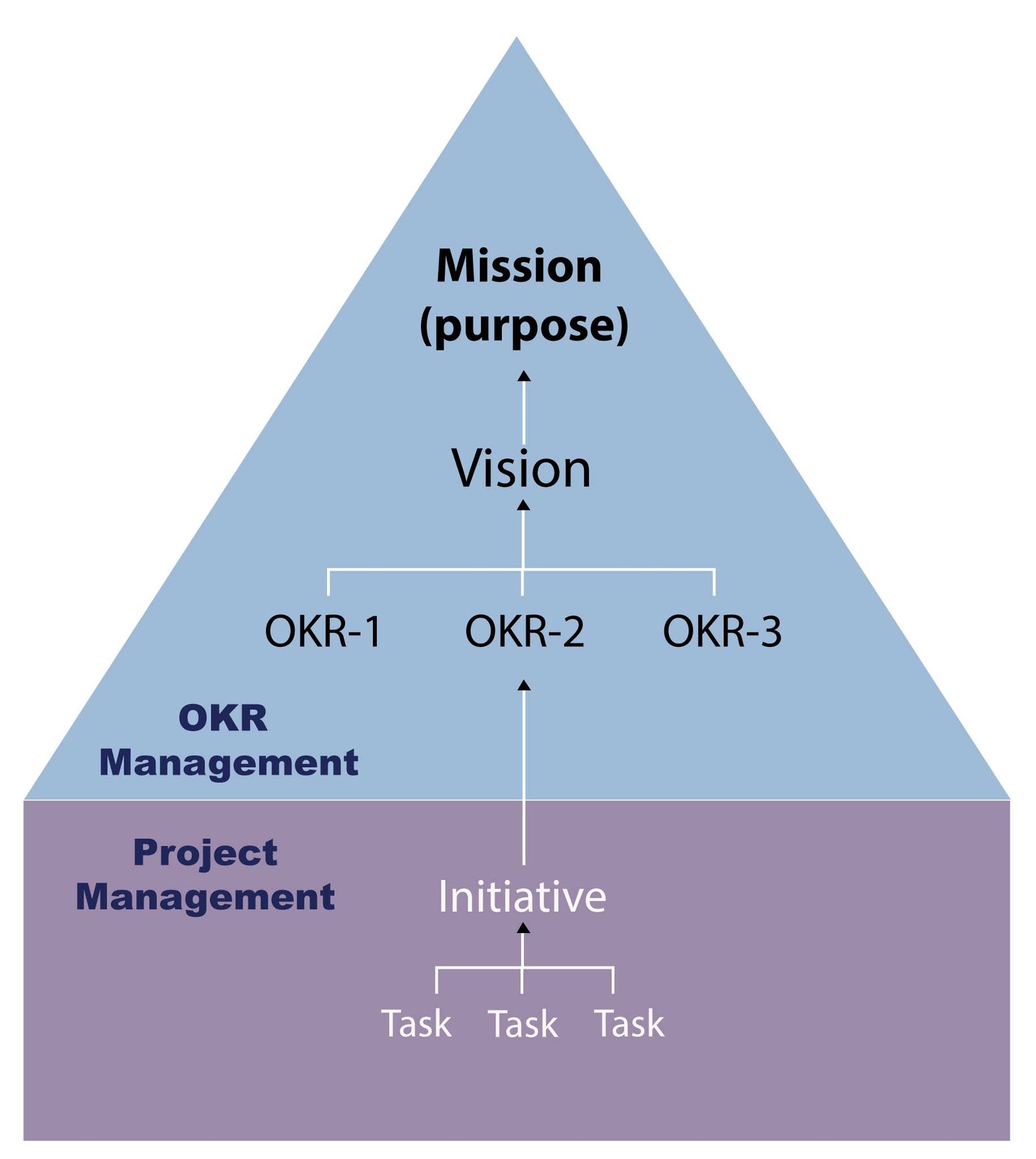 OKR is about giving the organization direction with overall visionary goals – Teams take those goals and turn them into their own OKRs – engineers use initiatives to move from “goal” to “project development”, where Agile Scrum takes over.
